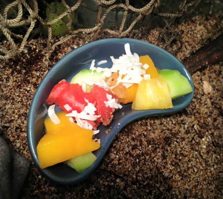 “I feed my two tiny girls the same things I feed my five bigger crabbies. For dinner last night they had smelt (a little bait fish), shrimp, cantaloupe guts, fresh pineapple with the skin, a piece of fresh coconut, baked potato (my biggest guy LOVES potatoes), hard boiled egg w/some shell, grapes, fresh spinach, dried cranberries. I also keep what I call a “seed cup” in the tank at all times. It has dried foods in it like chia seeds (which I also toss in the tank to sprout), meal worms, blood worms, dried shrimp, dried crickets, nuts, egg shell, powdered beet, carrot, bee pollen, spirulina, a dried seaweed blend, and ground flax. It sounds like tons of food, but there’s just a little bit of each thing.”