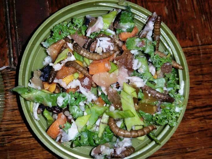 Canned meal worms, carrots, kale, coconut, sardines, blueberries, cherries, cabbage, cantaloupe pulp/seeds, pineapple, honey, flax seed, chia seed, hemp seed and coconut oil.